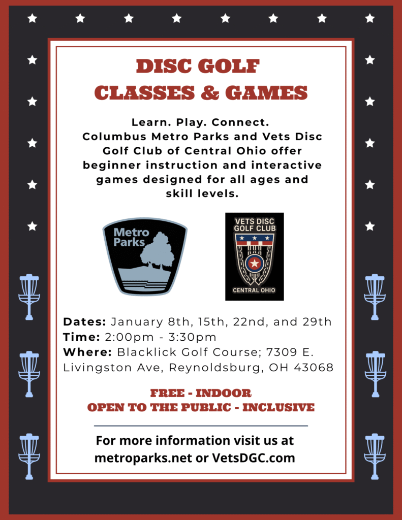 Learn. Play. Connect. Vets Disc Golf Club of Central Ohio and Columbus Metro Parks offer beginner instruction and interactive games designed for all ages and skill levels.